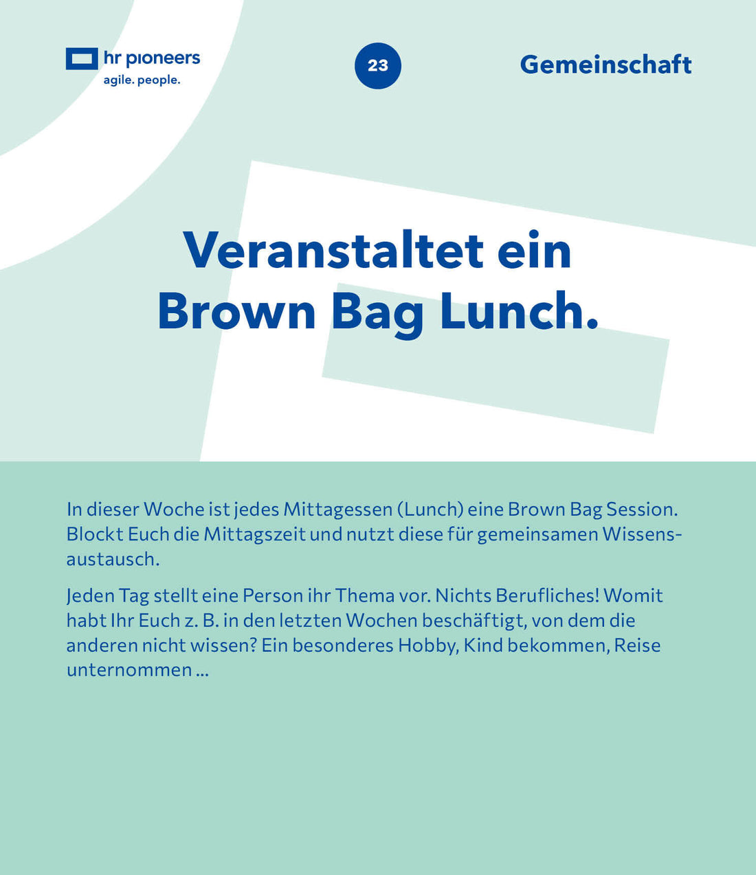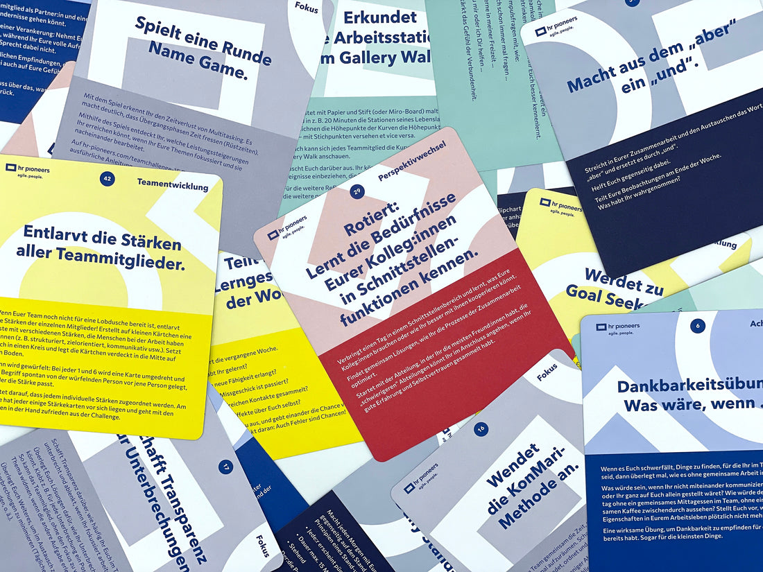 Die Team Challenge ist ein Kartenset, das für wir für Euren Einsatz im Team entwickelt haben. Auf Basis von Kund:innenerfahrungen. Es besteht aus 52 Impulsen, die Ihr ganz praktisch in Euren Arbeitsalltag integriert. Die Idee dabei ist, dass Ihr jede Woche eine neue Herausforderung also Challenge angeht. Teambuilding par Excellence!